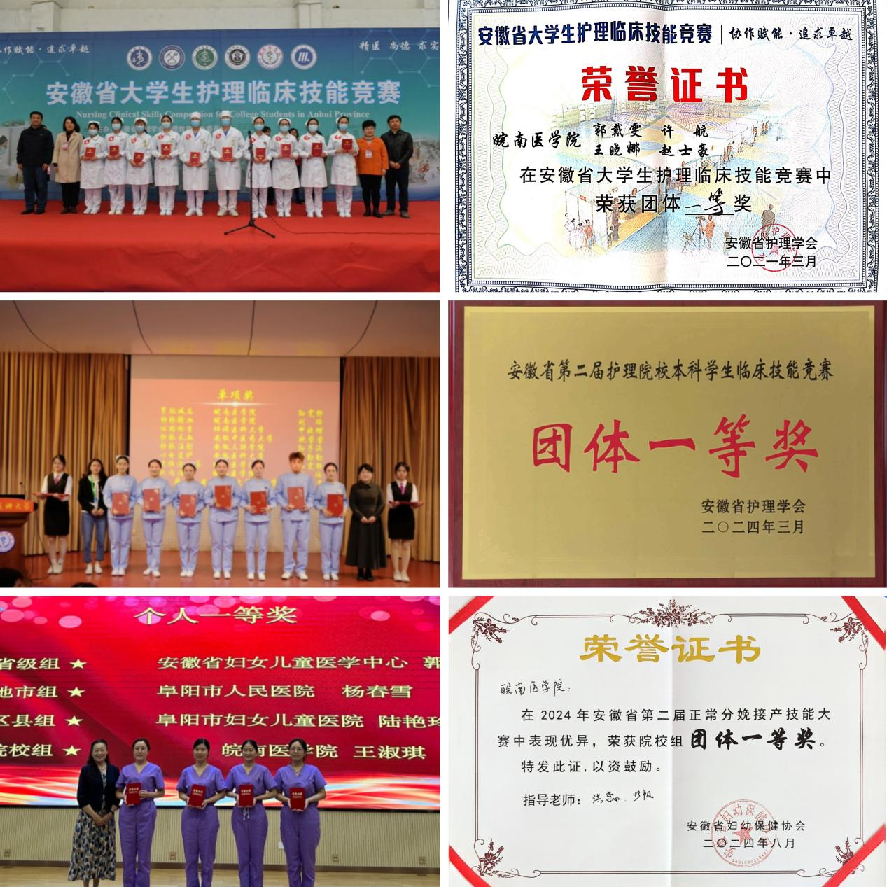 学生在全国首届、第二届护理学专业本科临床技能大赛中先后荣获三等奖、二等奖;2021年获第十届全国大学生技能比赛华东片区赛二等奖;2021年、2024年在安徽省第一、二届护理院校本科学生临床技能竞赛均获团体一等奖,共获9个单项奖;2024年在安徽省第二届正常分娩接产技能大赛中获院校组团体一等奖。