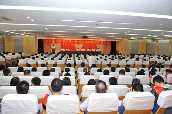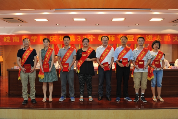 热血丹心育桃李,薪火相传写春秋。在全国第32个教师节之际,我校于9月9日在学术报告厅召开庆祝第32个教师节暨先进表彰大会,对2014/2015、2015/2016两个学年学校优秀共产党员、优秀党务工作者、先进党支部和优秀教师、优秀教育工作者、优秀辅导员、先进集体进行表彰。校领导王先俊、章尧、李刚、刘人人、廖圣宝、吴金月,处级干部,受表彰的先进集体和优秀个人,30年教龄教育工作者,师生代表以及临床(护理)学院代表近300人参加大会。大会由党委副书记、院长章尧主持。